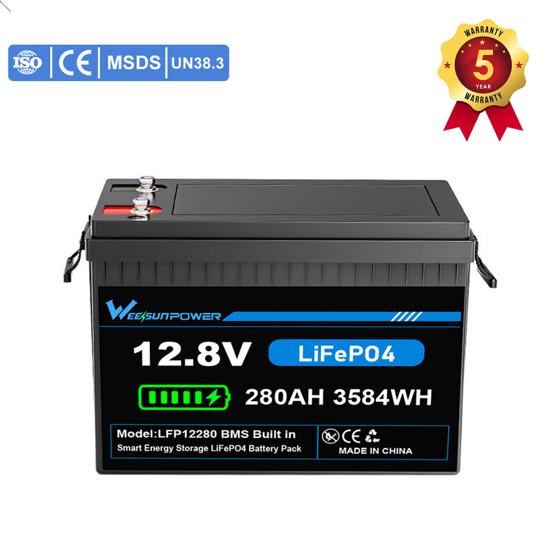 The nominal energy of our LiFePO4 12V280ah pack is 3584WH. The max discharge current can be 280ah.The weight is only 28kg which is 3 times lighter than lead acid battery.OEM/ODM is supported.Each battery holds ROHS CE UN38.3, MSDS, and IEC62619 certificates and we'll give 5 years warranty for each pack.